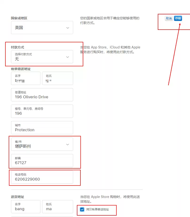 下面的送货地址直接勾选拷贝账单寄送地址,然后点击右上角的存储按钮。